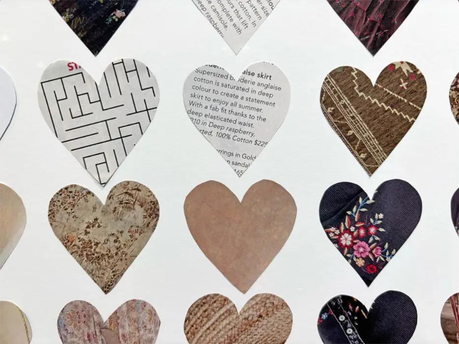 Over the years, she has transformed overlooked materials, from vintage linens to magazine pages, into works that critique consumer culture while honoring human resilience. Most recently, this journey led to The Hearts Project, a COVID-19 memorial honoring 13,068 Arkansans through thousands of hand-cut paper hearts. This evolving body of work invites reflection, remembrance, and a renewed way of seeing the world around us.